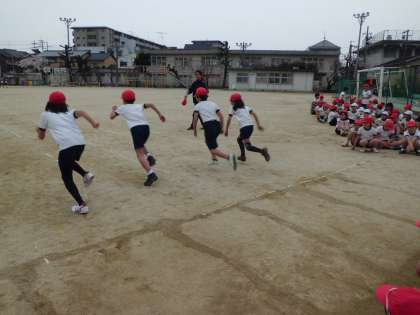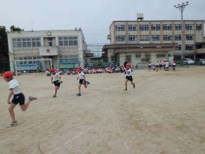 4年生は50mのタイムトライアルでした。力一杯走るのは久しぶりです。まっすぐ走ることの難しさを感じていたようです。