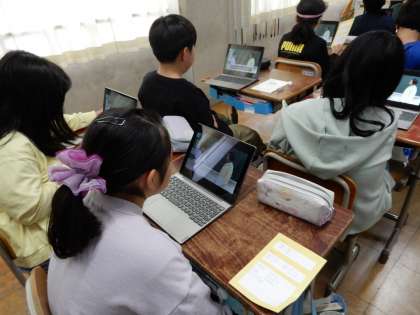 交流の仕方を動画で確認しています。動画を観ながら口々に呟いています。