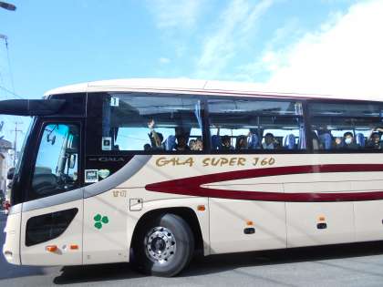 お天気が心配されましたが、薄日が差すなか、学校で出発式を終え、予定通りバスで出発しました。
