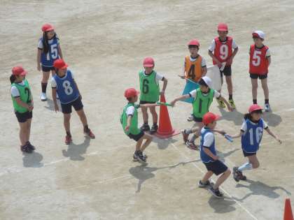 4年生の体育はリレーです。各チームは速く走る為に、走る順番を工夫したり、バトンの渡し方を考えたりしていました。