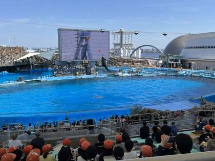 名古屋港水族館では昼食を取りながらイルカショーを見ています。