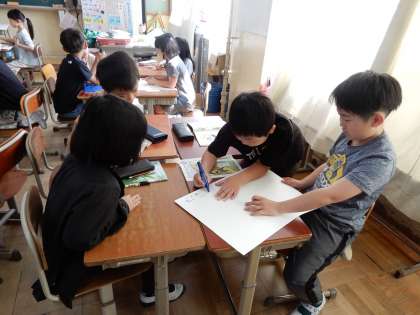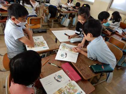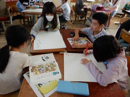 「そこで」や「けれども」の接続詞を使って物語をつくっています。
