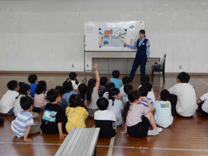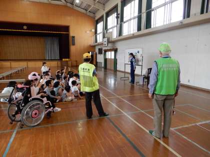 伏見署の方と地域の交通安全推進委員のボランティアの皆様に来ていただき、交通安全教室を実施しました。