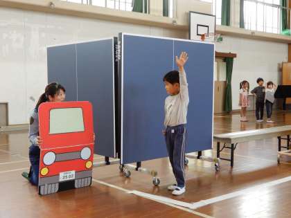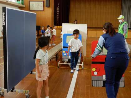 自動車の影では、前後左右しっかり見ること、点滅信号では止まることを体験しています。