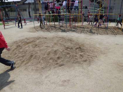 昨日,砂が届きました。遊具の下やでこぼこのところにまきました。ブランコもリニューアルオープンしました。