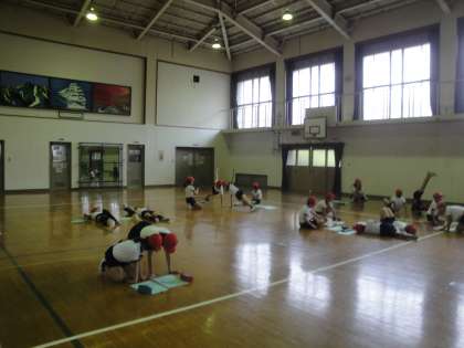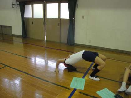 ブリッジや柔軟運動をして,心と体をほぐしました。