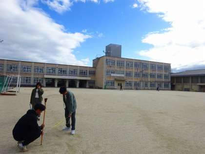 朝から、グラウンドでは、ソフトボール投げのライン引きをしています。