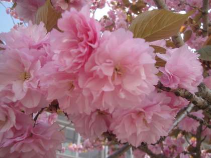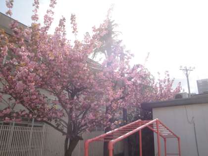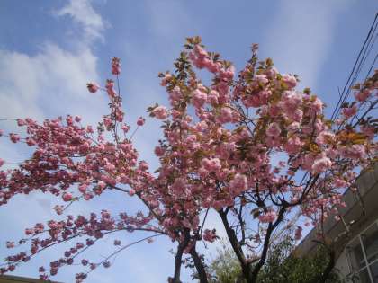 学童横には,ヤエザクラが咲き誇っています。風に揺られ,満開の花びらは今にも散ってしまいそうです。今がピークのようです。