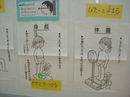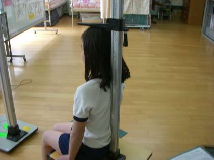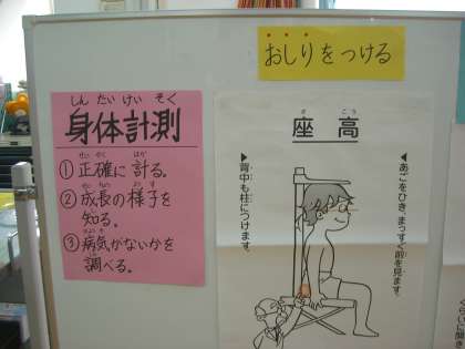 今日,欠席者の身体計測も終わりました。4月の健康診断の時期だけ,いつもの身長,体重に加え,座高も計ります。身体計測で大事なことは「正しく計ること」で,座高ではお尻をつける,身長ではかかとをつける,体重では静かにのってぴたっと止まることを話しました。初めての1年生も,とっても上手に受けることができました。