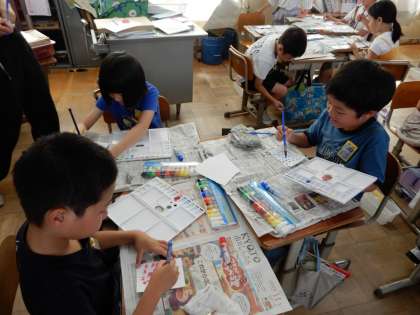 水の量を変えたりいろんな絵の具を混ぜたりして、表現方法を工夫していました。