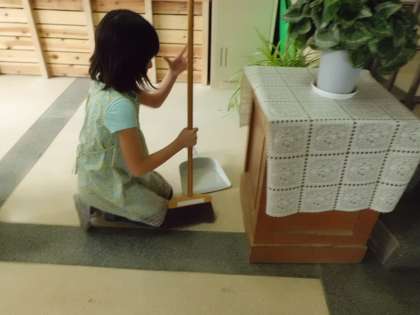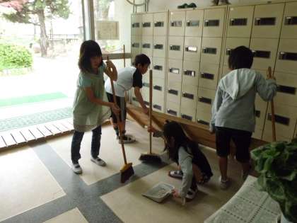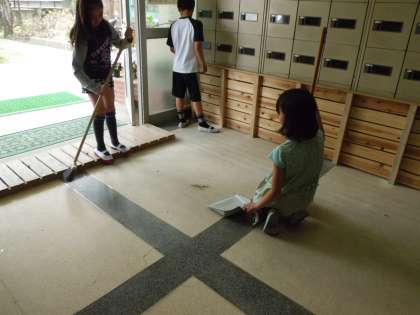 こどもたちは一生懸命に玄関の掃き掃除をしています。