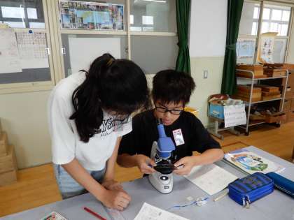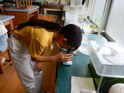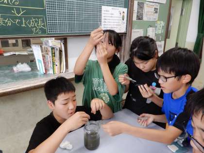 池や川の水中にいる小さな生物をスポイトで吸って顕微鏡で観察しています。