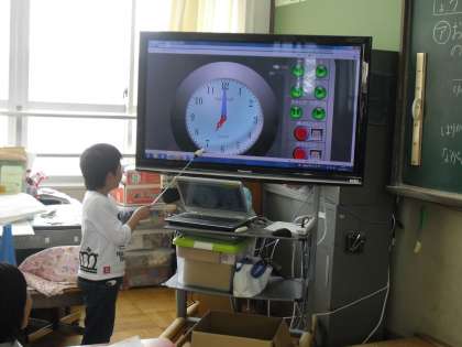 その後,○分後の時刻を5・10・15…と考えたり,10・20…ととばしてみたり,さまざまな考えがでてきておもしろかったです。前に出てきて,大きな時計やパソコンの時計で説明をしています。