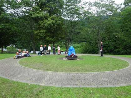 モルックをやっている際に、レク係が、キャンプファイヤーの練習をしています。
