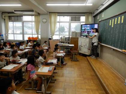 モデルとなる動画をみて、自分たちも同じように進めています。質問し合いながら笑顔で答えています。