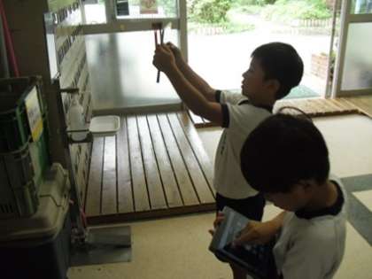 ポスターや看板などを探して、何を伝えているかを考えているようです。