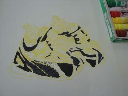コンテの線を消さないように,水の量に気をつけて丁寧に色をつけています。
