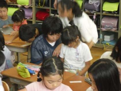 優しく教えてもらって「ありがとう!」と言っている1年生の姿、照れくさそうにしている6年生の表情がとっても素敵でした。