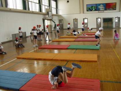 2組さんは体育でした。できる技を組み合わせたり、新しい技に挑戦していました。