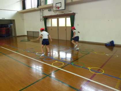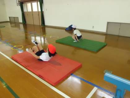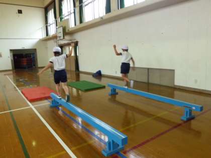 2年生は平均台を組み合わせたサーキットを楽しんでいます。バランスよく行けるかな。