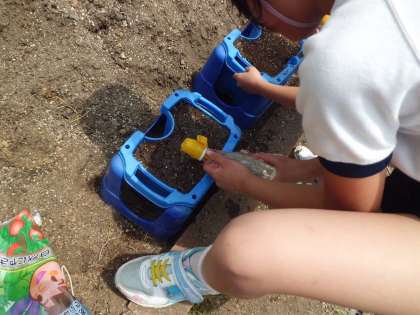 2年生は今日,植木鉢に土をいれミニトマトの種をまきました。どんな実ができるのかとっても楽しみです。