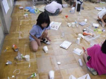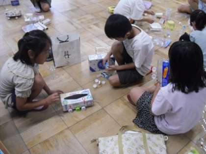 風をつくるのにストローで吹いたりゴムを使って飛ばしたりしています。