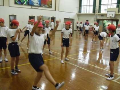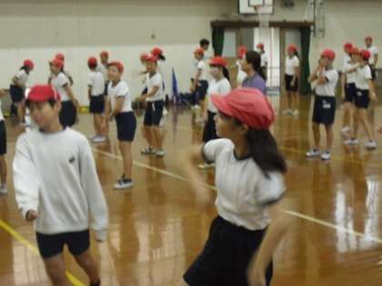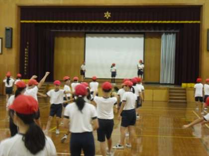運動会で行う団体演技を子どもたちが作っています。みんなの前にいるのは実行委員の子たちで、自分たちで振付けを考え、みんなに伝えています。