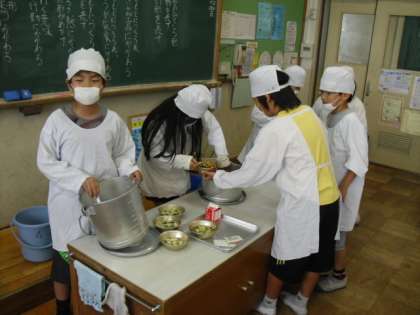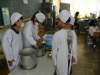 給食の配膳をみんなで協力してやっています。4年目にもなると、配膳のスピードもはやくなってきました。