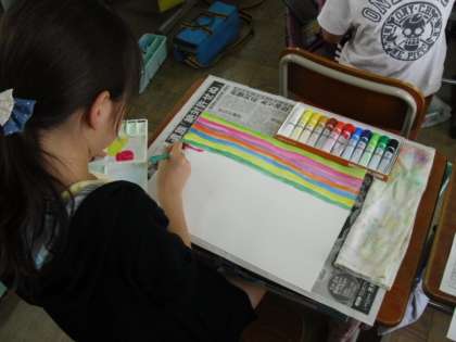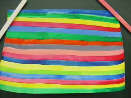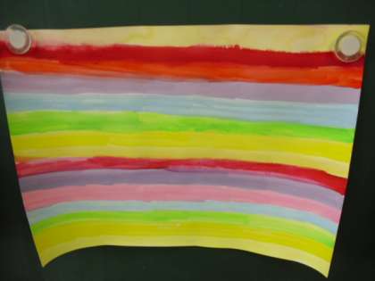 4年生図工では『絵の具の不思議』を始めました。横向きに直線で色を塗って・・・