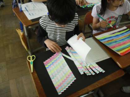 横向きに直線で色を塗って,始めた「絵の具の不思議」。できあがりました。自由参観の時に掲示をしますので,ご覧ください。