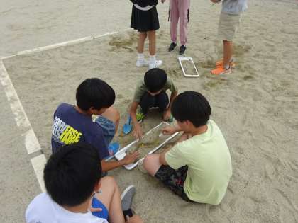 砂場の砂を用意して、水の通る道を作り、水がどのように流れていくのか、左右の砂や土がどのようになっていくのかを調べます。