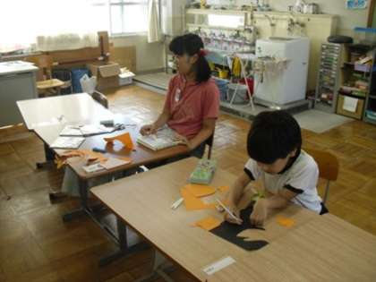 ハロウィンと誕生日パーティーの飾りつけを一生懸命作りました。完成した飾りを前に貼り付けながら、みんなで協力しています。