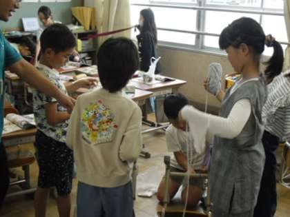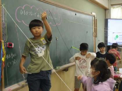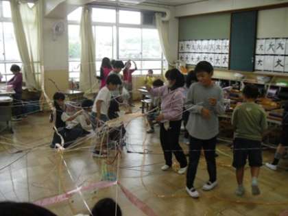 教室内でひもをつないで場所の様子を変える活動をしていました。