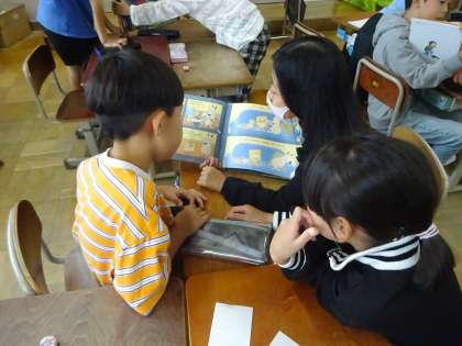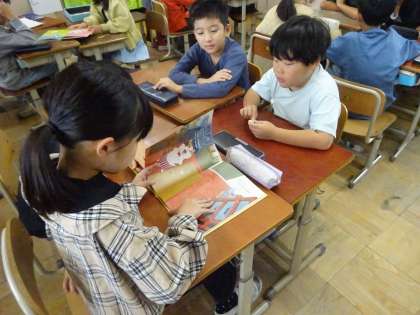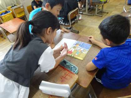 1年生に読み聞かせをする本を決め、グループで役割分担をして、読み聞かせの練習をしています。