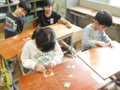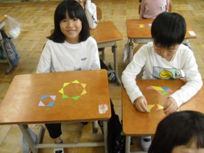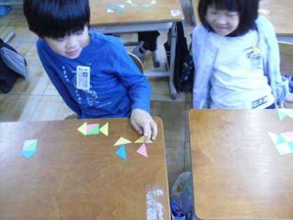 三角形の色板を並べて、いろいろな形を工夫して作っています。