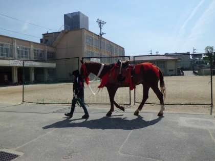 神輿巡行で学校にお神輿が入ってきました。