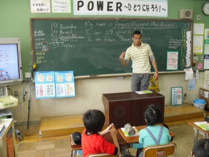 英語でのあいさつやアンガス先生の好きな食べ物・スポーツなどを聞きました。