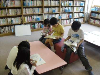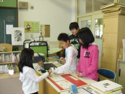 お待たせしました。今日から図書館を開館しました。中間休みとお昼休みに図書館が開いています。たくさん本を借りに来てください。1年間で,めざせ100冊!!