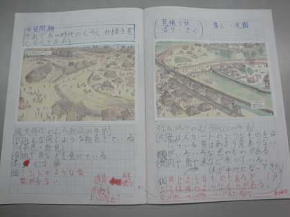 縄文時代と弥生時代のむらや人々のくらしの様子を比べました。