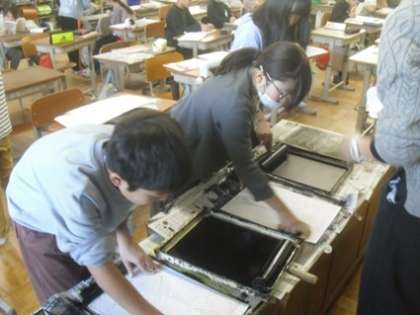 一生懸命に彫り上げた版にインクを乗せて紙に刷り上げる工程を楽しんでいました。