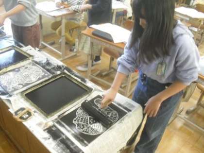 子どもたちが彫り進めていた版を紙に刷る活動を行っていました。