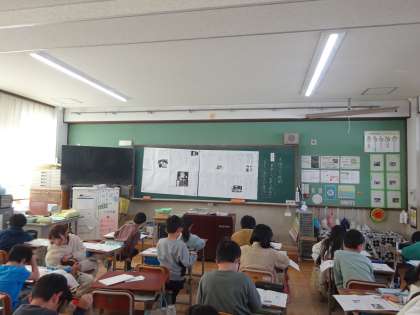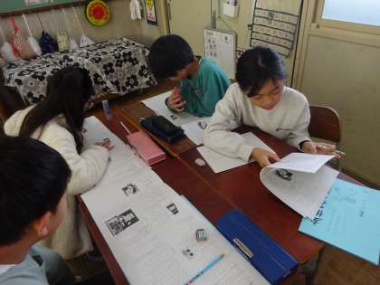 全文シートを見ながら、登場人物の心情変化を読み取っています。