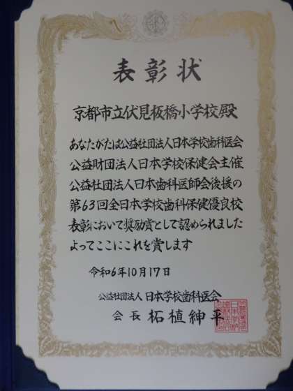 第63回全日本学校歯科保健優良校表彰において、奨励賞を受賞しました。