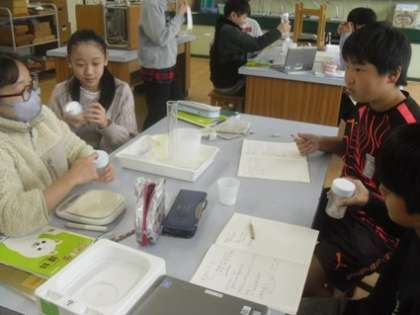 まずは、食塩とミョウバンを水に溶かし、水と比較して、温めるとどうなるかを実験しています。子どもたちは真剣に取り組んでいます。