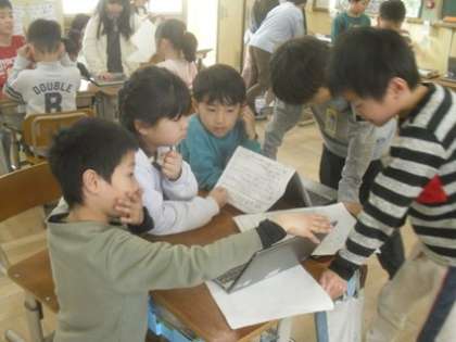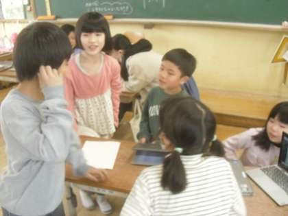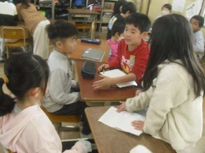 3年生の教室に2年生が訪れ、3年生が調べてきた伏見板橋小学校のことについて伝えています。
