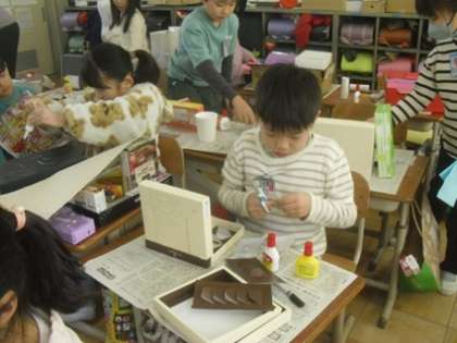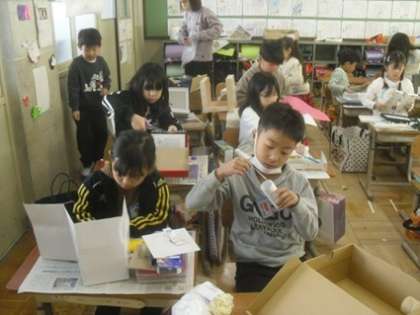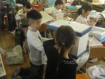 箱を並べたり積んだりして、「小さな友だち」が喜ぶハウスを考えながら取り組んでいます。