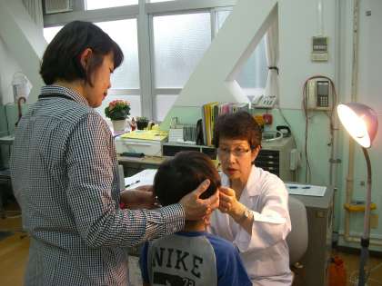 校医の橋本先生に,プールに入る前に目の病気がないかを調べていただきました。目の病気が見つかった人にはお知らせをお渡ししますので,早く受診してください。