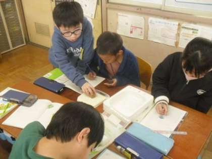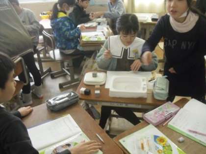 同じ体積でも物の種類が違うと重さは変わるのか予想して、調べています。