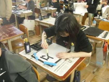 横画・たて画・左はらい・点・点画の接し方、左右の組み立て方、そして筆順のポイントを確認しながら「平和」という文字を書きました。