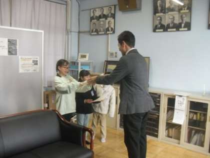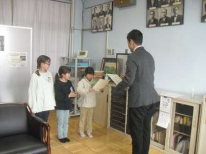 水泳記録会に出場した児童が優秀な成績を収めたため、校長室で表彰してもらいました。